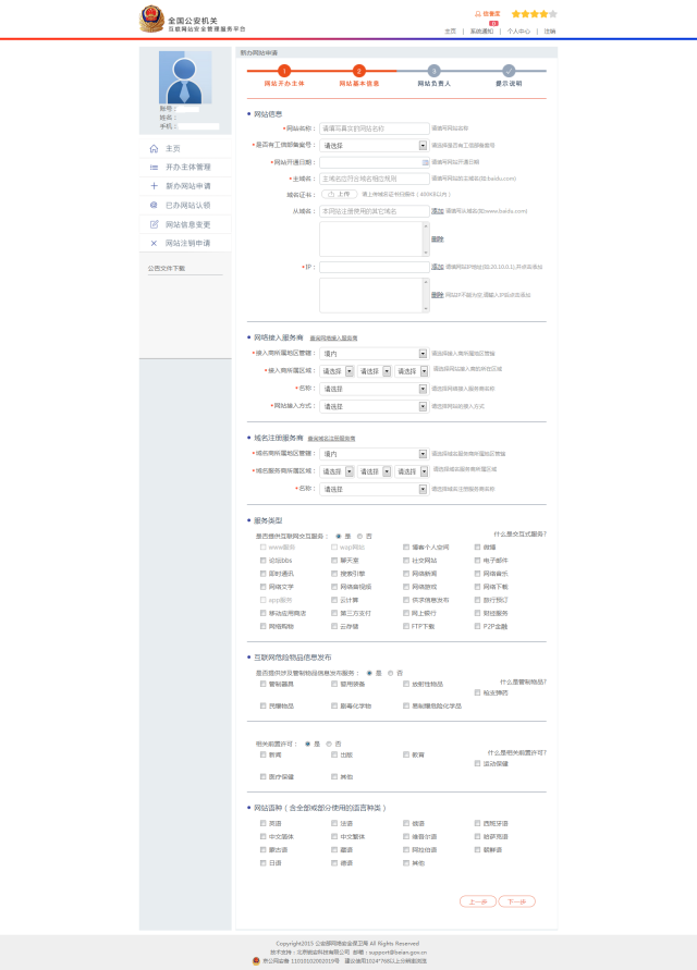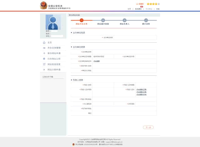 二、登錄系統以后,按步驟填寫網站主辦單位信息、負責人信息及網站信息,進行提交