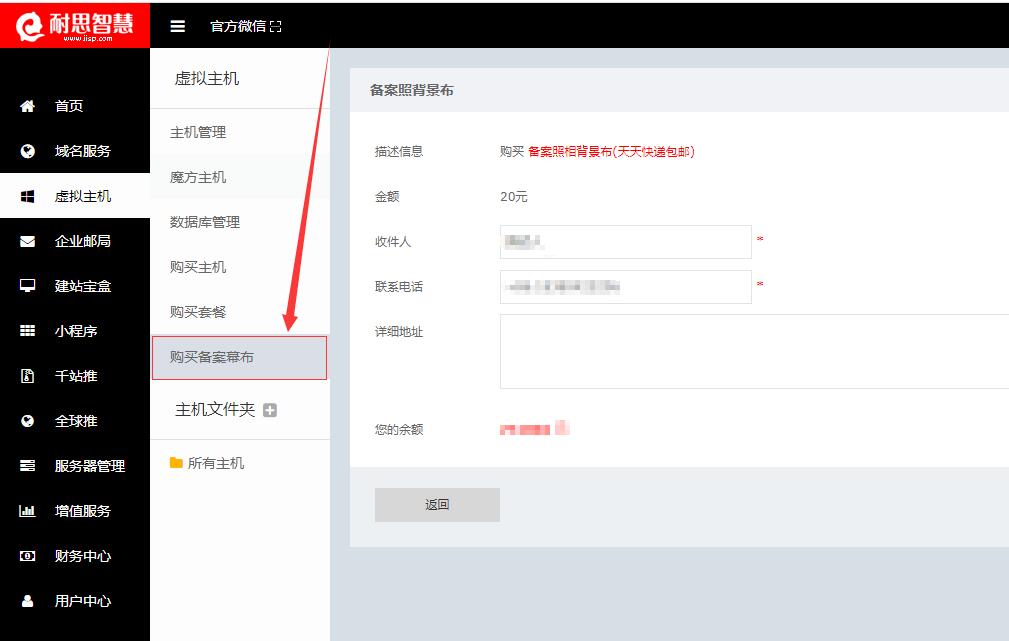登陸用戶后臺控制中心,主機 → 購買備案照相背景布(如以下截圖)