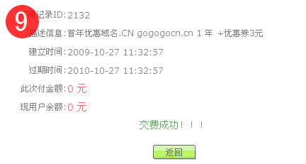 9、已交費,點擊“返回”查看域名。