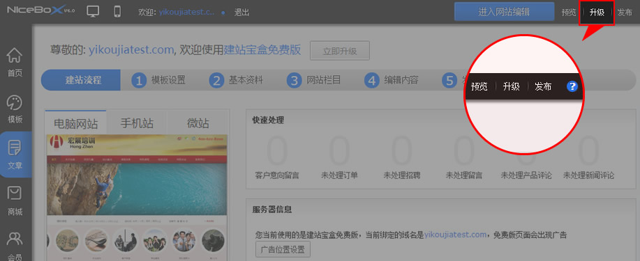 贈送的建站寶盒可以升級為更高級的版本,您僅需登錄建站寶盒管理后臺,在右上角點擊升級即可。