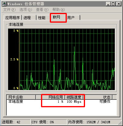 然后在"開始"->"運行", 輸入 "taskmgr",出現 window任務管理器, 選擇 "聯網" 就可以看到 服務器帶寬占用情況.以下圖為例,表示帶寬是 1M帶寬 (0.01*100).