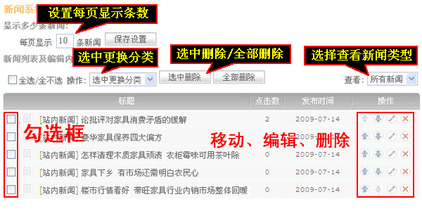 這里主要設置每頁“顯示多少條新聞”,新聞列表及編輯內容里面可以選中更換新聞的類別、“選中刪除”、“全部刪除”,可以按類型查看新聞。新聞操作還可以對新聞進行位置移動編輯刪除