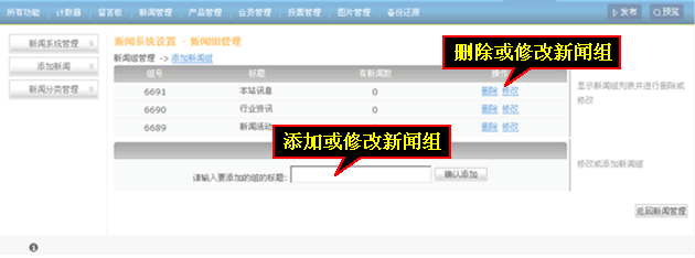 新聞分類管理主要對已有的新聞組進行刪除修改添加新聞組,輸入后點擊“確認添加”。