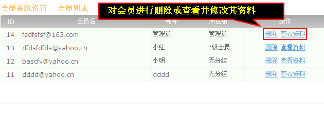 點(diǎn)擊“刪除”可以刪除會員,點(diǎn)擊“查看資料”可以對會員的資料進(jìn)行修改及密碼修改。