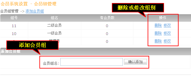 這里可以刪除修改會員組,可以添加會員組,輸入會員組名后點(diǎn)擊“確認(rèn)添加”。