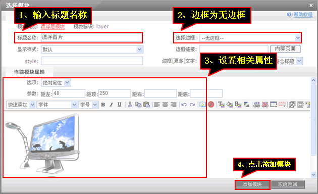 3、輸入“標題”,選擇“邊框”,設置“相關”屬性后點擊“添加模塊”,通過設置參數調整漂浮內容的位置,漂浮內容可以自由編輯。