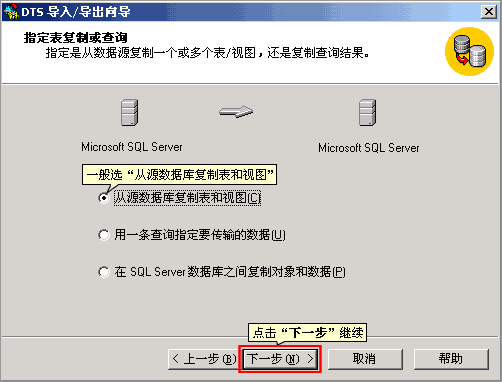 | 5. 選擇復制方式,一般選“從源數(shù)據(jù)庫復制表和視圖”,點“下一步”繼續(xù) | |