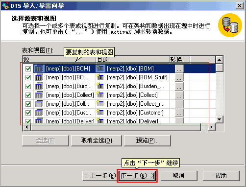 | 6. 選擇要復制的表和視圖,點“下一步”繼續(xù) | |