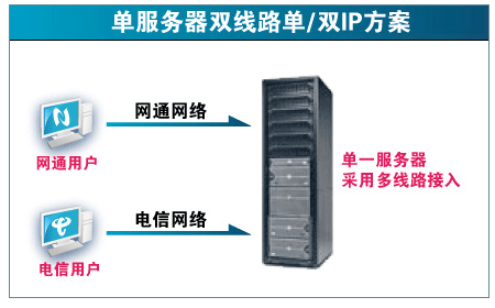 2. 單IP的雙線:單IP雙線服務是在機房路由器級根據用戶線路,切換相應的電信/網通線路。 但由于大部分雙線路機房是從電信、網通獲得IP地址。沒有權限切換線路。導致根本無法達到全網快速的目的。 而一部分有IP自治域的機房,卻無法獲得從電信/網通獲得足夠的帶寬。 導致用戶訪問速度并不理想。