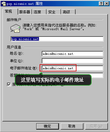 2:如果WEBMAIL收發(fā)正常,請檢查郵件軟件,比如OUTLOOK或者FOXMAIL設(shè)置,以下以O(shè)UTLOOK為例,按圖設(shè)置好用戶信息中的電子郵件地址為您的電子郵件地址,比如abc@nicenic.com,請?jiān)O(shè)置為全稱.